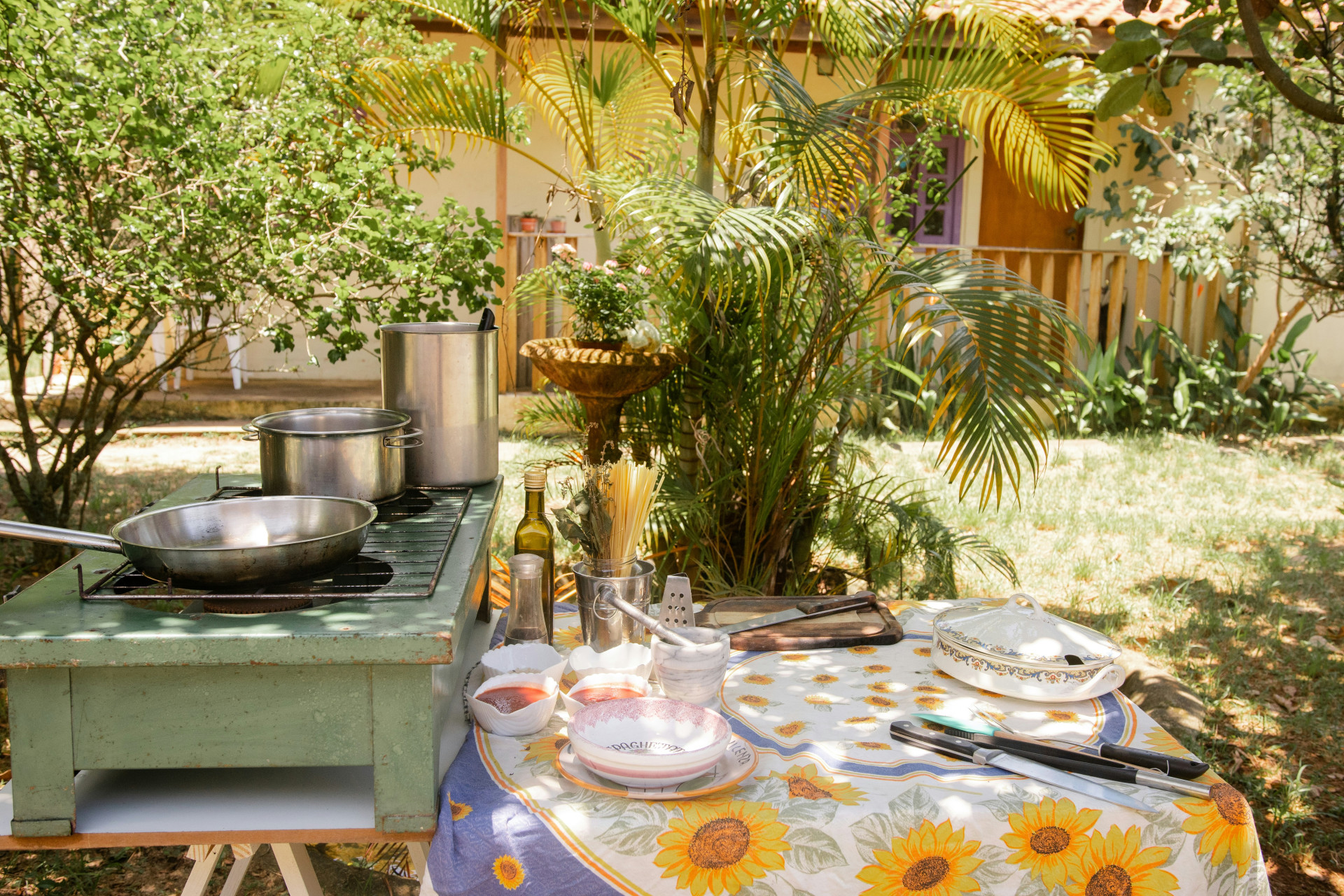 Happy Cooker udekøkkenet samler flere funktioner i én enhed og giver mulighed for at tilberede hele måltidet udendørs. Konstruktionen består af pulverlakeret jern, og grillristen er fremstillet i porcelænsemalje, hvilket bidrager til holdbarhed og nem rengøring.